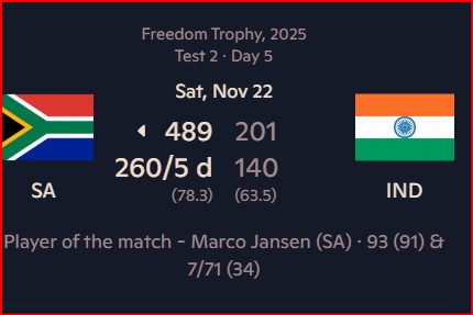South Africa defeated India 2–0 in the Freedom Trophy Test series (Nov 2025)