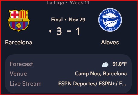 Barcelona defeated Alavés 3–1 at Camp Nou in their La Liga clash on 29 November 2025. Dani Olmo scored a brace, while Lamine Yamal added one goal. Pablo Ibáñez had given Alavés an early lead.